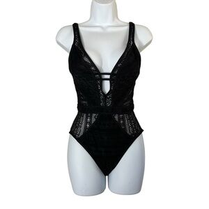 BECCA Color Play Crochet Lace One-Piece Swimsuit. Stretch-hinted lace—left peekaboo sheer in just the right places—creates an hourglass shape on this plunge-neck swimsuit. Plunge neck. Removable soft cups (included). Moderate back coverage. Partially lined. M=8-10