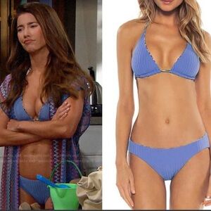 Stylish bikini with animal print. Triangle top with adjustable ties. Matching bottoms with blue side panels. Perfect for a chic beach look.