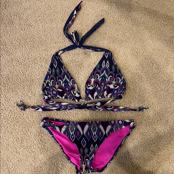 Stylish bikini with vibrant patterns. Halter neck design. Comfortable fit. Top- Cup size D. Bottoms- Medium