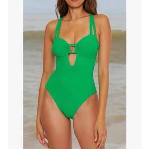 BECCA Standard Modern Edge One Piece Swimsuit Plunge Neck Green Large NWT