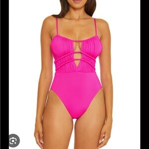 Sophisticated black one-piece swimsuit with stylish ruching. Perfect for any swim occasion.