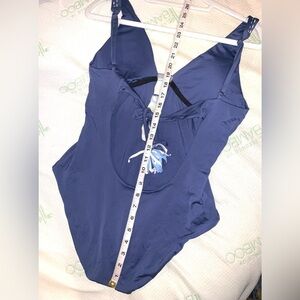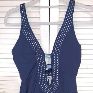 BECCA blue lattice and tassel plunging one piece swimsuit Large