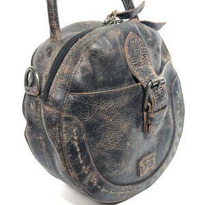 Authentic Bed Stu distressed bag. Unique round compact crossbody that has a small front exterior pocket with a magnet close, and a small slip one on the back that make it not just cute, but functional. It has a padded handle, zip-top close and a removable, and adjustable crossbody strap to switch up your look.