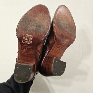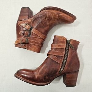 Tan leather ankle boots with buckle details and zip closure. 2.5" heel. Size 7. EUC.