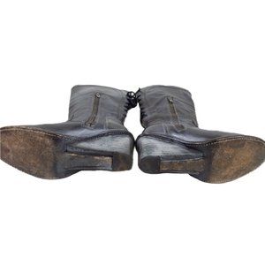 Side perforation and worn leather construction detail this wedge heel boot. Gently worn, minor creases on front. Heels good conditon.