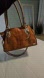 Stylish tan Bed Stu leather women's bag with elegant detailing. Vegetable tanned leather shoulder bag has padded strap or wear as a crossbody. Crossbody strap is detachable. Perfect for everyday and every season use. Straps are tan leather with a white distressed look.
