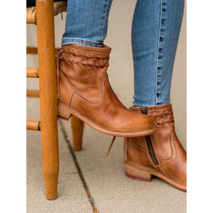 BED STU TAN CRAVEN LEATHER FRINGE WOVEN DETAILS ANKLE BOOTIES BOOTS SZ 8.5