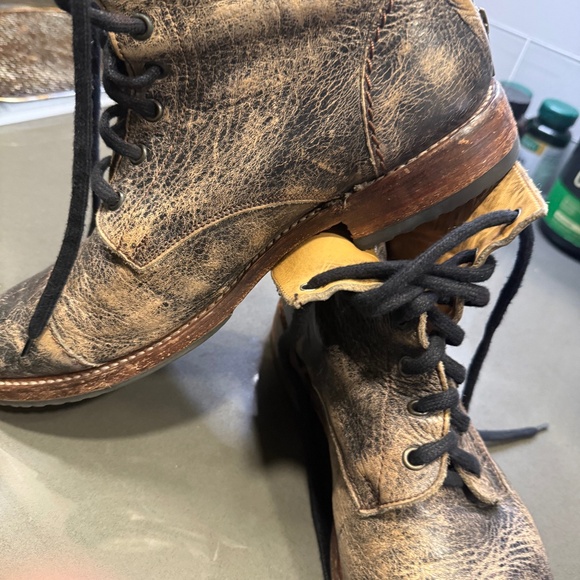The Bed-Stu Men's Distressed Leather Lace-Up Boots in size 10 feature a convenient back zipper for easy wear. These ankle boots in solid brown color have a round toe shape and are made of leather, with a durable leather outsole suitable for winter, fall, and spring seasons. The lace-up closure adds a stylish touch to the casual boots, while the distressed leather upper and lining materials give them a unique and rugged look. Perfect for any man looking for a versatile and fashionable footwear option.