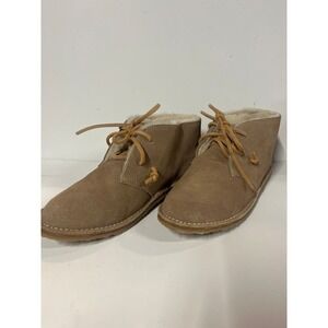Cozy and stylish desert chukka boots featuring soft suede exterior and plush shearling lining for ultimate warmth and comfort. Classic lace-up design with leather laces. Perfect for casual winter outings, weekend brunches, or running errands in style. The textured rubber sole provides good traction. Shows minimal wear, in excellent pre-owned condition.