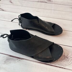 Sleek, sculptural, and handcrafted with care — these BEEK “Loon” sandals combine artisan quality with minimalist, boho-chic vibes. Made from soft black leather with copper rivet detailing and oiled braided leather ties at the back, they’re a stylish and versatile warm-weather staple.