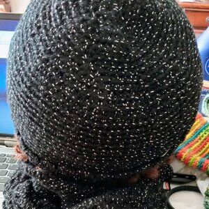CROCHETED BEENIE and FRILLED NECK SCARF made with black yarn with silver streaks.