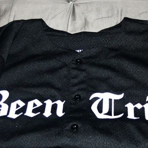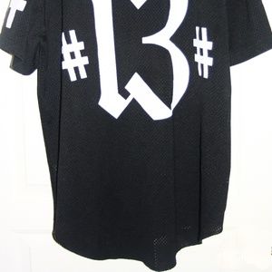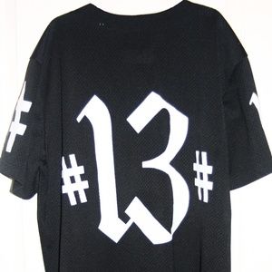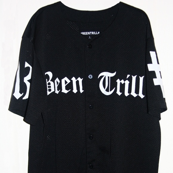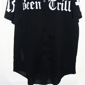 From the former art collective/dj crew, #BEENTRILL# streetwear sensation; Black and white #BEENTRILL# button up jersey still in perfect condition. No stains, tears or other signs of wear. Right sleeve has "13" on it, left has #, back of Jersey reads "#13#". Men's size Large.