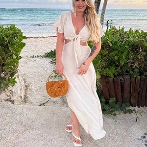 BEIGE TIE FRONT CUT OUT SPLIT HEM MAXI DRESS