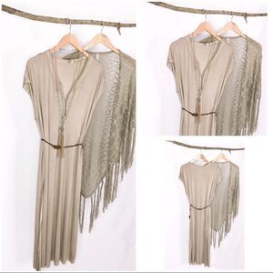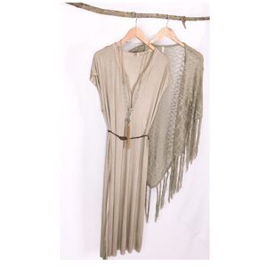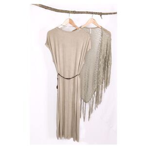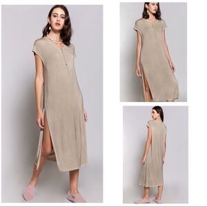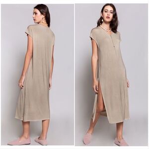 BEIGE Y Neck Maxi Dress Tunic with Side Slit