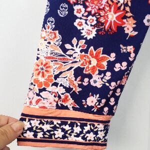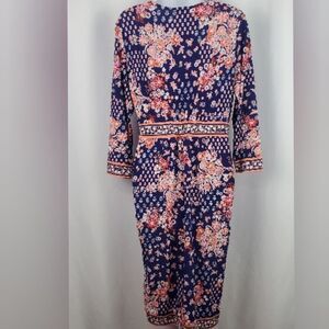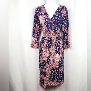 Floral Faux wrap pullover dress. Has beautiful navy, orange and peach floral design with peach trim. Midi length. In excellent condition.