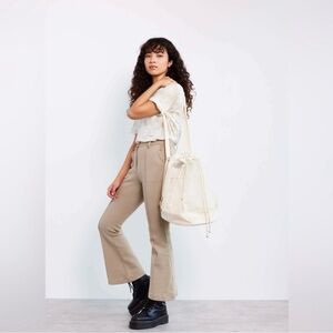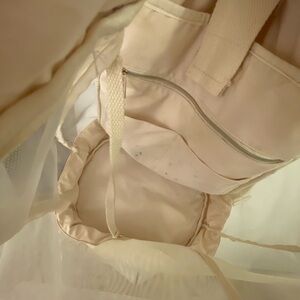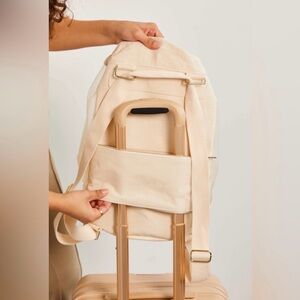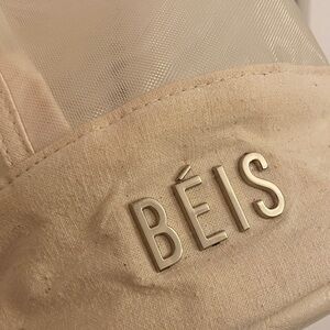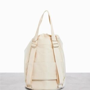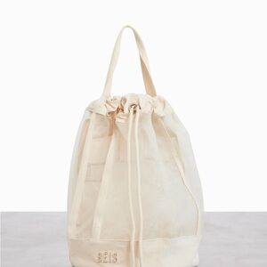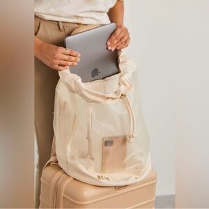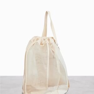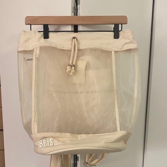 Beige mesh backpack by BEIS. Features drawstring top and roomy interior, zipper close luggage strap, key leash, inner pockets, and vegan leather bottom. The straps on the back allow you to convert the bag from tote to backpack. This pre-loved bag has some ink stains on the inner pockets and a slight blue denim stain on the luggage strap. The backpack straps have some pilling. Originally $78 and no longer sold by BÉIS. Perfect for the beach, concert, or fashion forward travel.