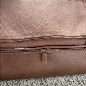 Material: Poly canvas body, vegan leather trim, 100% poly lining, nylon zipper, and zinc alloy hardware.