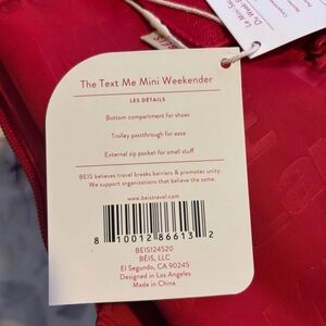 Compact red weekender bag by BEIS. Features bottom shoe compartment and external zip pocket. Ideal for travel.