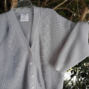 A1175. A simple statement cardigan with attractive knitted patterns across the front and 3/4 sleeves. Button up with beautiful front buttons. Ribbed hem and sleeves. Bust = 23"; L = 24"; Sleeve = 17.5.
