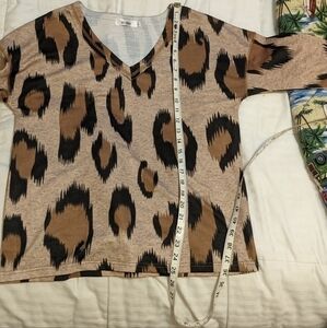 Belinda long sleeved lightweight almost sweatshirt feeling top with large animal prints and a v-neck size small. it has a good amount of stretch it is nice and cozy on the inside. the colors and wrist bands have a bit of a raw edge. I'm not familiar with this brand but it seems like a pretty big small so please see the pictures for measurements A5