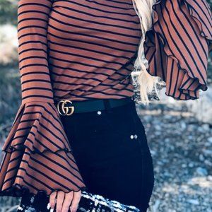 BELL SLEEVE BROWN AND BLUE STRIPPED TOP.