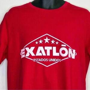 This Bella + Canvas tee features a bold EXATLON EU graphic on a vibrant red backdrop. Crafted from soft, breathable cotton, it offers a comfortable fit suitable for everyday wear.