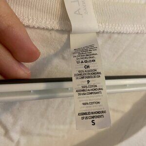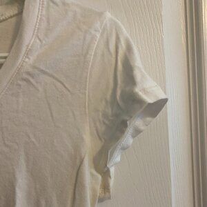 White short sleeve women's T shirt with pixel art style picture of characters from the video game "The Great Ace Attorney".