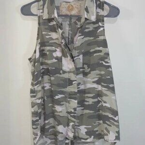 BELLA DAHL Camo Sleeveless Top. Size extra small (but seems to run a bit larger) Approx. measurements: pit to pit 19", shoulder to bottom in front 24" in back 27". Comfy flowy light weight breathable material. 100% Tencel.