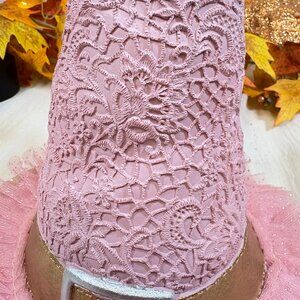 Made from durable resin, this decorative piece features a soft pink hue, delicate lace-like brim detailing, and luxe feminine vibes perfect for Halloween or Summerween lovers with a coquette or shabby chic aesthetic.
