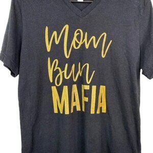 BELLA+CANVAS. WOMEN'S BLACK/GOLD SHORT SLEEVE V-NECK MOM BUN MAFIA FUNNY GRAPHIC T-SHIRT SIZE LARGE IN EXCELLENT CONDITION!