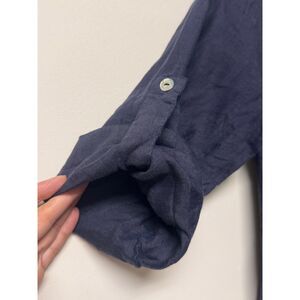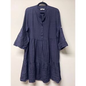 This is a generous size medium 100% linen dress in navy blue. Roll tab sleeves with mother of pearl buttons. Made in Italy.