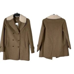 New with tags Size: large Color: Oat Approximate measurements 20.5” across bust while buttoned and 31” in length A soft wool blend crafts a longline coat that is complete with a faux shearling collar for cozy-style. • Faux shearling notch collar - removable • Long sleeves • Dual breasted closure • 60% wool, 40% polyester