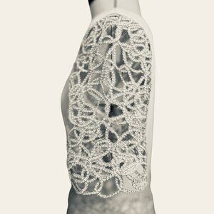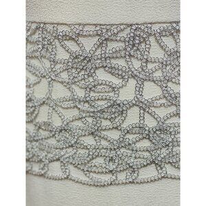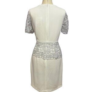 BELLE by BADGLEY MISCHKA ~ Women's size 8 ivory above-the-knee dress with silver openwork sleeves and peplum. Fully lined. Hidden back zip closure and round neck. This luxurious sheath is perfect for a wedding, cocktail party, or a formal night out. Some stretch.