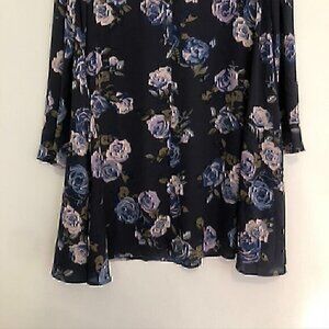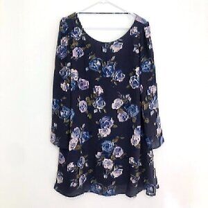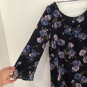 BELLE BADGLEY MISCHKA Navy Blue Green Rose Floral Long Flare Sleeve Shift Dress