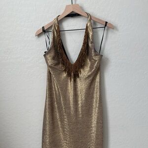 BELLE Badgley Mischka Gold Fringe Beaded Neckline Halter Dress Gown Size 6