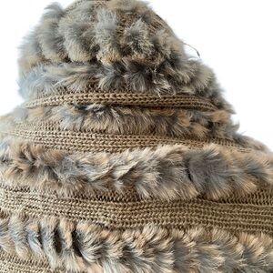 Knit and rabbit fur outer, fringe detail, pockets, open front.