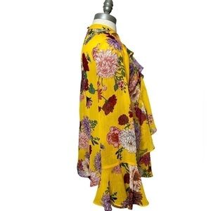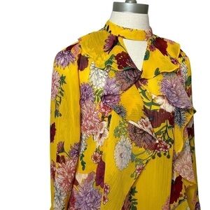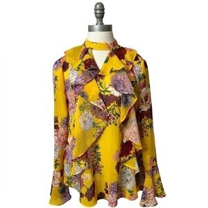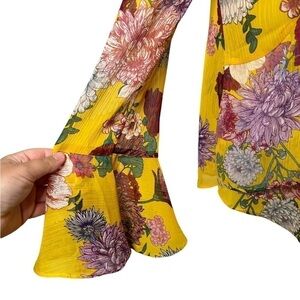 BELLE & Sky Yellow High Neck Ruffle Long Bell Sleeve Floral Printed Top Medium