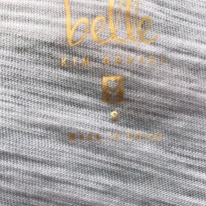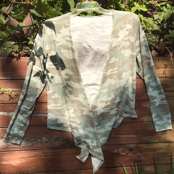 This cute camouflage open top by BELLE by kim gravel is super lightweight… giving you just the comfort you need to keep the goosebumps off your skin!! Its made from 60%votton and 40%Modal It was featured on QVC . The cute tie at the waist makes the style unique. It is NWOT never been worn