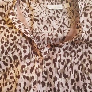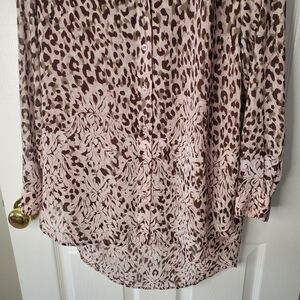 Button front, L/sl buttons, high/low hem, shear fabric, lined, wear open or belted, career/office, day to night, stylish, comfortable animal/floral print (runs large)