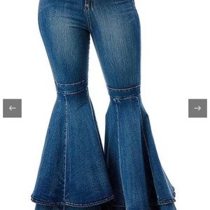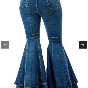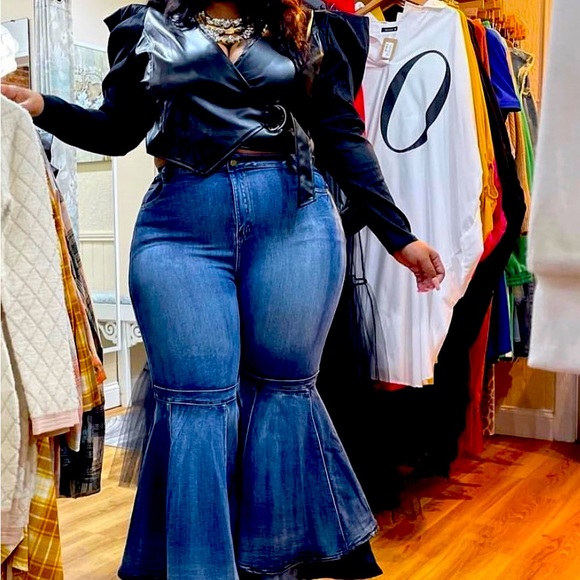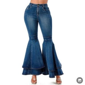 Layered bell bottom jeans w/ EXCELLENT stretch!! Will comfortably fit curvy 14 to 16 possibly 18 max… model in cover shot wearing size XL