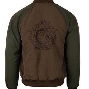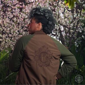 Be the most stylish halfling amongst the Crown Keepers in this effortlessly chic bomber jacket inspired by Orym of the Air Ashari. The block-toned olive green and brown outerwear piece features a ribbed collar and waistband, Critical Role logo zip-closure, side pockets, and a quilted inside lining of a step and repeat pattern of the engravings featured on Orym’s sword and shield. To add a little razzle dazzle, the back of the jacket has a raised embroidered design of the Air Ashari style vines, clouds, and Cathus and Ruidus moons.