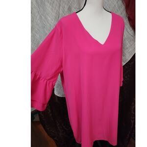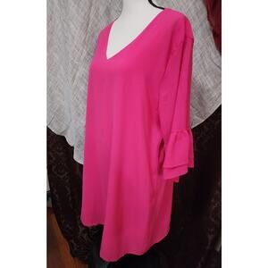 short dress, V-neck, bell sleeve, soft lining, zipper in back.