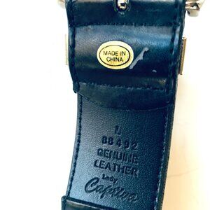 Like new is this trendy Bo Ho style belt. Unlike many this is all leather. l. It is substantial and the silver disk are perfect and weighty. The size is stamped large but be sure to check the measurements shown in the picture to insure accurate fit. Wear this with a black dress, skirt of pants and you will be a knock-out.Note: photo does not display silver as shiny as it is and black as a deep black. From the buckle inseet to the outermost hole is approximately 36”.