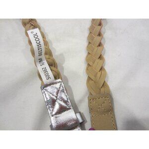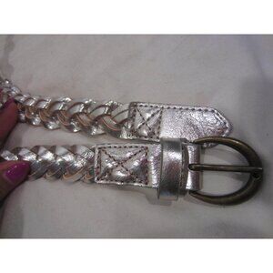 This is for a gently used belt, if ever. It is BELTISCOOL brand. It is a 1 inch wide leather belt that is a silver metallic color and is braided. It has a simple brass buckle and the belt measures 34 inches. It is marked 500362 S/M.
