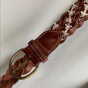 • The first one is brown leather in a braided pattern with white flowers sewn in. Lightly used but in great condition and super cute!