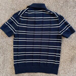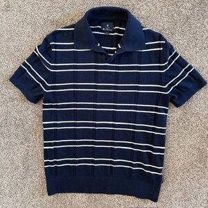 BEN SHERMAN Navy Blue and White Striped Short Sleeve Polo Sweater Small