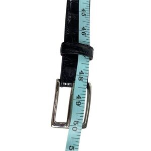 Elevate your style with this sleek black leather belt. Shiny finished Caiman crocodile belt in a dressier 1 1/8" width, have a single belt loop, beautifully feathered edges, and chrome plated solid buckle. Perfect for any occasion, this belt adds a touch of sophistication to your outfit.
