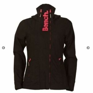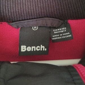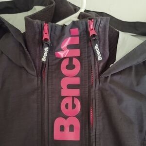 It has a hood, cuffs at the sleeve and the neckline and features the Bench logo in bold pink lettering vertically on the front.