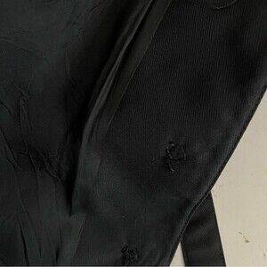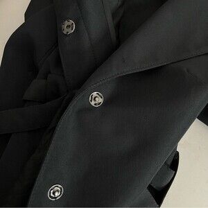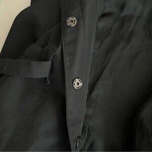 The definition of modern meets classic. It's got all the elements you need to give your outfit an updated twist—think slightly oversized collar and sleek almost silky fabric in a timeless design. The inside snaps appear to be hand sewn on, and there are a few loose threads. The snap closure is hidden under the front panel. I the size on the tag is 44 based on measurements and fit I would consider it a size small. My model wears a size 4, and it fits her quite well as you can see in the pictures. Approx measurements, 19” underarm to underarm, 15” shoulders, 25” long.