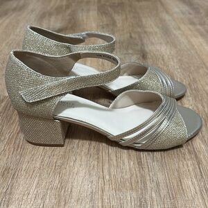 - this mid-heeled shoe is made with an elegant pewter shimmer material and has a TPR sole